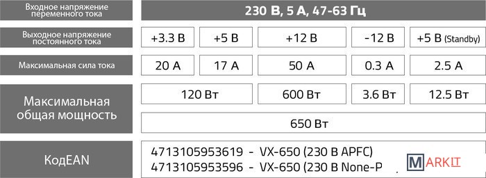 | Комбинированная нагрузка по +12V | 600 Вт |