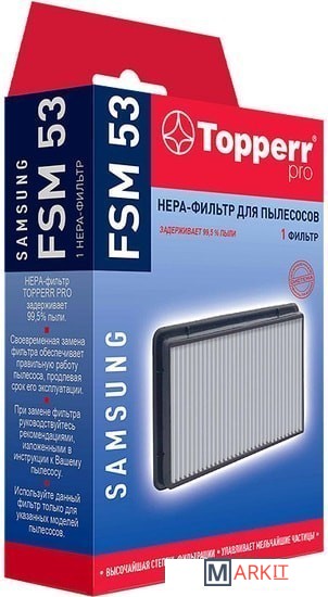 HEPA-фильтр FSM 53 для пылесосов SAMSUNG. Обладает высочайшей степенью фильтрации, задерживает 99,5% пыли. Благодаря специальным свойствам фильтрующего материала, фильтр улавливает мельчайшие частицы, позволяя очищать воздух от пыльцы, микроорганизмов, бактерий и пылевых клещей.