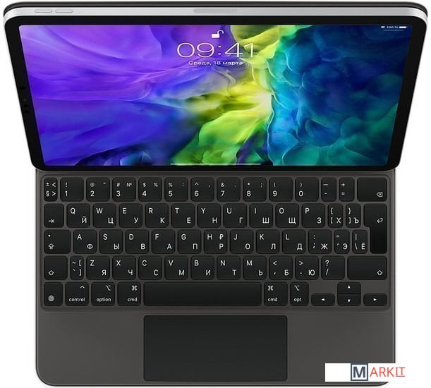 Совершенно новая клавиатура Magic Keyboard станет идеальным дополнением к iPad Pro. С её помощью печатать на iPad удобно как никогда. Встроенный трекпад открывает новые возможности для работы с iPadOS. Порт USB‑C позволяет заряжать iPad. А ещё Magic Keyboard защищает устройство с обеих сторон. Эта клавиатура особой конструкции примагничивается к iPad Pro и удерживает его на весу. При этом можно плавно менять угол наклона, чтобы подобрать идеальное положение.Полноразмерная клавиатура, которая точно реагирует на ваши действия и позволяет печатать почти бесшумно: клавиши с подсветкой оснащены механизмом «ножницы» с ходом 1 мм.Встроенный трекпад поддерживает жесты Multi‑Touch и курсор в iPadOS.Угол наклона крепления можно плавно менять, чтобы подобрать идеальное положение.Встроенный порт USB‑C позволяет заряжать iPad Pro, освобождая его собственный порт для подключения других аксессуаров.В сложенном виде превращается в чехол, который защищает iPad Pro с обеих сторон.Совместима с:iPadPro 11 дюймов (1-го, 2-го, 3-го или 4-го поколения) или iPad Air (4-го или 5-го поколения) под управлением iPadOS 14.5 или более поздней версии.Клавиатура имеет русскую раскладку.