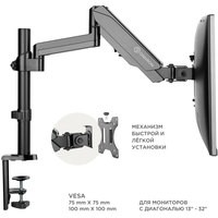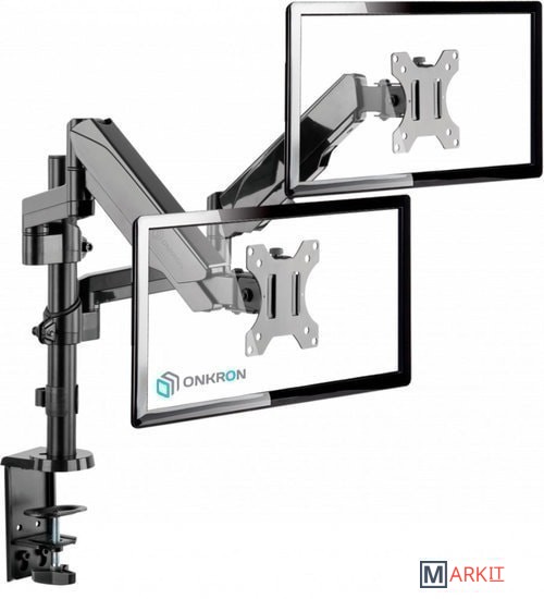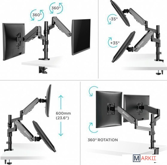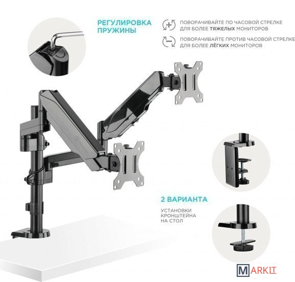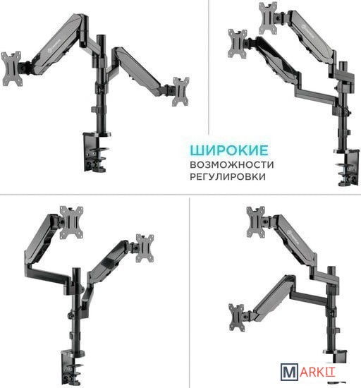 Функциональные особенности поворотный, с регулировкой высоты, кабель-канал, струбцинное крепление / поворотный, с регулировкой высоты, кабель-канал, струбцинное крепление, для 2 мониторов