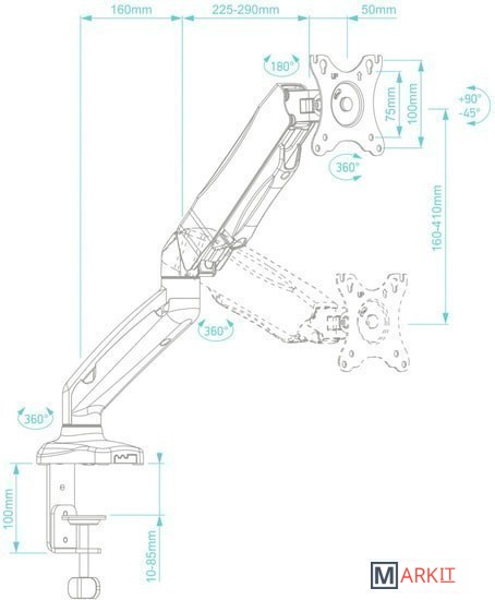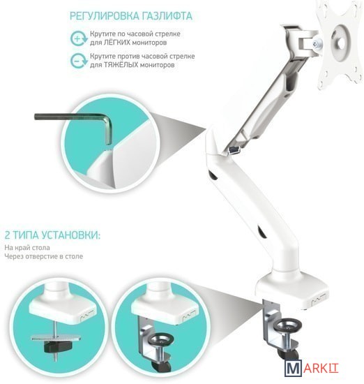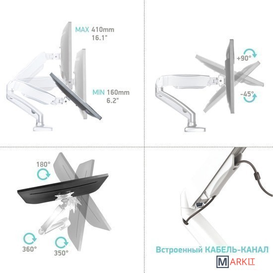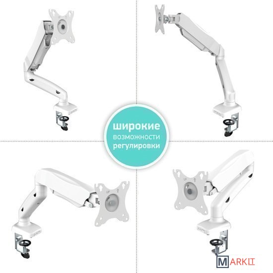 Функциональные особенности поворотный, с регулировкой высоты, кабель-канал, струбцинное крепление