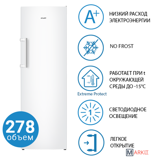 Новая модель морозильников ATLANT 2022 года - серия ADVANCE.Высота модели М-7606-N 1868 мм, общий объем 278 л.В морозильнике предусмотрено 8 отделений различной вместительности.Преимущества наличия системы No Frost в морозильнике ATLANT: равномерное распределение охлажденного воздуха; быстрое охлаждение продуктов; отсутствие инея в морозильнике.Новый дизайн: конструкция двери High Door, лаконичные формы, эргономичная вертикальная ручка-скоба, верхняя корзина с откидной панелью для удобства эксплуатации.Улучшены потребительские свойства холодильника: электронное управление Touch Control, LED освещение, режим суперзамораживания, наличие звуковой сигнализации с возможностью ее отключения.Более эффективно организовано пространство: наличие поддона для замораживания ягод и др. мелких продуктов, увеличенного отделения Big Box для замораживания и хранения крупногабаритных продуктов, двух емкостей Slim Space на двери морозильной камеры, формы для льда.Максимальный диапазон климатических классов: SN, N, ST, T (стабильная работа при температуре окружающей среды от 10 до 43°C).