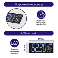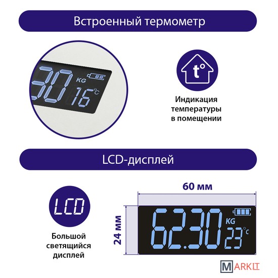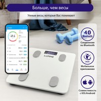 Функциональные особенности расчет доли воды, расчет доли жировой ткани, расчет доли мышечной ткани, расчет доли костной ткани, расчет ИМТ (BMI), индикация температуры помещения, индикация заряда батареи