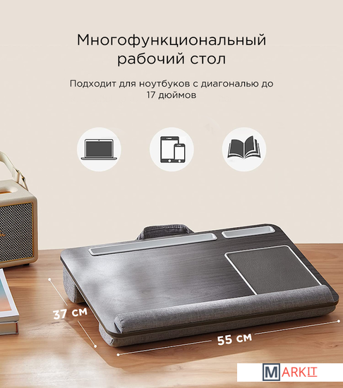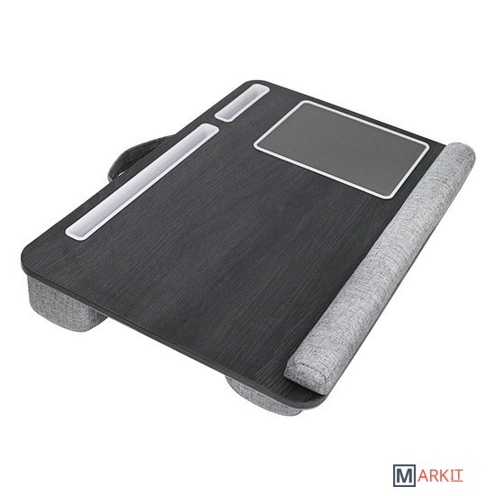 Подставка для ноутбука с мягким основанием EVOLUTION LS201 это МНОГОФУНКЦИОНАЛЬНЫЙ РАБОЧИЙ СТОЛ. Материал: 9 мм МДФ. Спонжевое наполнение (сверхплотная пена) в тканевой обивке. Размер подставки: 550 * 370 * 100 мм Лежа на кровати или диване или в путешествии, его можно использовать как подставку для ноутбука, рабочую подставку, стол для чтения в любой ситуации. ПОМОГАЕТ ЭКОНОМИТЬ ПРОСТРАНСТВО - Поставляется с держателем для планшета/ручки, держателем для телефона и ковриком для мышки, так что вы можете иметь все в одном месте и в результате сэкономить место. УДОБНАЯ И БЕЗОПАСНАЯ КОНСТРУКЦИЯ - Подушка для запястья длиной около 55 см расслабит запястье и предотвратит соскальзывание ноутбука. Подходит для ноутбуков всех размеров до 17 дюймов. Двойная опорная подушка обеспечивает комфорт на коленях и удерживает ноутбук под более удобным углом. ЛЕГКАЯ И ПОРТАТИВНАЯ - Поставляется с ручкой, которая позволяет удобно переносить его с места на место во время путешествий или рабочей поездки.
