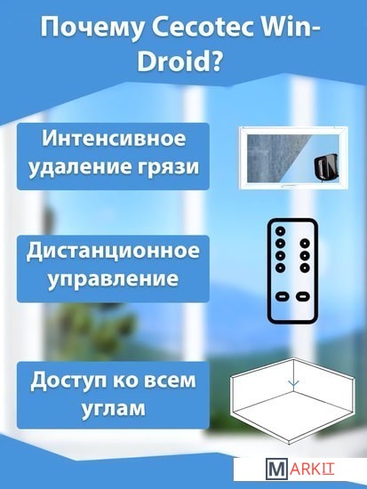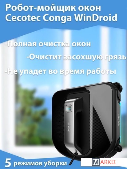 Чистые окна без усилий? Думаете, это сказка? А вот и нет, ведь с роботом-мойщиком окон Cecotec Conga WinDroid ваши окна всегда будут чистыми, достаточно закрепить робота и просто нажать на кнопку. Робот оснащен вибрирующей шваброй, умной навигацией, 5 режимами очистки, возможностью удаленного управления, 5-этапной системой очистки и функциями безопасности. Кроме того, вам не нужно будет лезть за ним на окно, ведь робот останавливается в месте начала уборки.Умная навигация iTech Win 4.0Автоматичный мойщик окон убирает по N- и Z-образному маршруту, чтобы не пропустить ни одного участка. А с помощью умной навигации робот с легкостью рассчитывает лучший путь уборки.Уборка в 5 этапов и режимыАвтоматический робот-мойщик окон Cecotec Conga WinDroid имеет 5 функциональных режимов уборки, которые подойдут для плитки, стекла, окнах снаружи и внутри, а также для гладких поверхностей.Вибрирующая швабраМоющая швабра робота-мойщика окон постоянно вибрирует во время уборки, это помогает справляться со стойкими загрязнениями и удалять сложные пятна.Надежная система безопасностиДумаете, как только вы закрепите робота снаружи, он упадет? А вот и нет, ведь он оснащен мощным всасывающим насосом, страховочным тросом, умным алгоритмом защиты и бесперебойным источником питания. А после окончания уборки он останавливается благодаря системе AutoStop.Датчик обнаружения препятствийИногда дизайн окон предполагает наличие разных наружных элементов. Но не беспокойтесь, как только робот обнаружит препятствие, датчик против столкновения изменит его траекторию.Дистанционное управлениеВам не нужно отвлекаться от своих дел, чтобы перенаправить робота. Все это можно делать удаленно. В комплекте к устройству поставляется пульт ДУ!ЭкологичностьКомпания Cecotec заботится не только об эргономичности и качественности всех своих устройств, но и об экологии. Салфетки из микрофибры можно использовать много раз.Быстрая очистка и тихая уборкаРобот-мойщик окон Cecotec Conga WinDroid не будет вам мешать во время проведения мойки окон, ведь он негромко работает. Не подстраивайтесь под устройства, пусть они подстраиваются под ваш ритм.