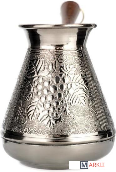Удобная лакированная ручка из натурального дерева не будет нагреваться при использовании, а металлическое кольцо позволит подвешивать турку и удобного хранить её. Узкое горлышко способствует наилучшему раскрытию вкуса. Подходит для приготовления натурального кофе на газовых и электрических плитах.